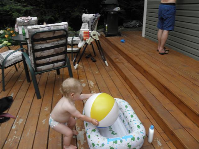 Then he tried out his new climbing structure - he likes sliding! He loved chasing around the backyard after the brand new ball his parents got for him at their visit to Canadian Tire on the way over. Then he tried out the garage Barbara found a a recent neighbourhood garage sale.